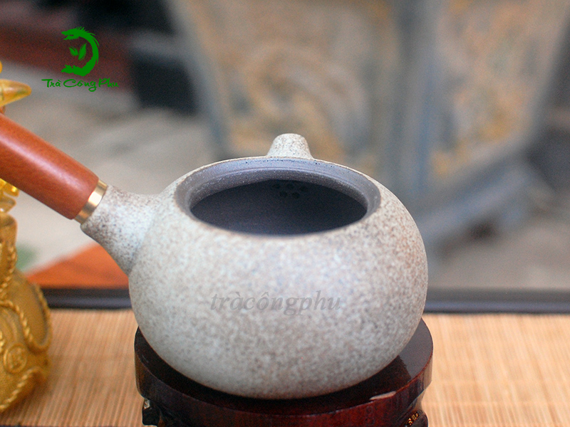 Nắp ấm có lỗ thông hơi, khít với miệng ấm, có thêm dây buộc chắc chắn, khi rót nước trà có thể nghiêng 90 độ mà không bị rơi. Núm Ấm còn được cách điệu bởi hạt đá ngọc tròn nhỏ màu hồng nhạt và trông đơn giản mà không kém phần tinh tế, sang trọng.