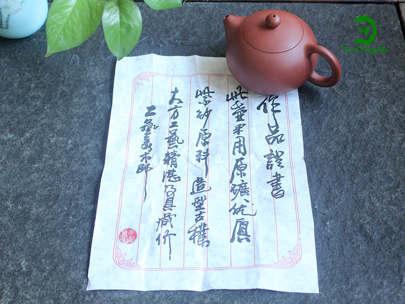 Kèm theo với ấm là giấy bản thao viết tay của tác giả.