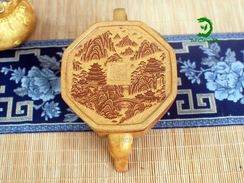 Trên thân chiếc ấm tử sa, bức họa giang sơn hiện lên sống động như một bức tranh thủy mặc thu nhỏ. Những ngọn núi trùng điệp nối tiếp nhau, uốn lượn như sóng biển, tạo cảm giác hùng vĩ và bất tận. Xen giữa là những tán cây rậm rạp, gợi nên sự trù phú của thiên nhiên. Nổi bật hơn cả là hình ảnh những ngôi đền lầu, tu viện tháp cổ kính ẩn hiện giữa núi rừng, vẻ đẹp hùng vĩ và không gian tĩnh lặng, linh thiêng, tựa như chốn bồng lai tiên cảnh. Từng nét khắc tinh xảo, uyển chuyển đã khéo léo tái hiện cảnh sắc non nước hữu tình, vừa trang nhã vừa sâu lắng, khiến chiếc ấm không chỉ là vật dụng thưởng trà mà còn là tác phẩm nghệ thuật chan chứa hồn cốt giang sơn.