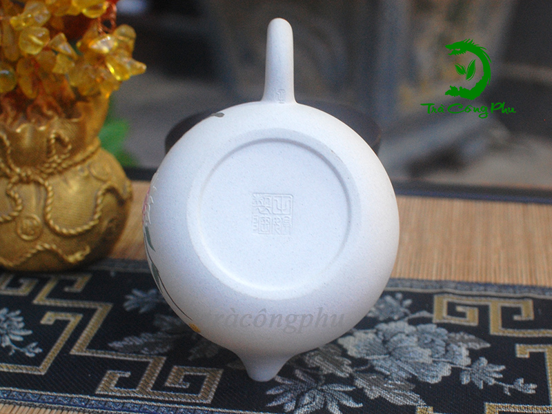 Đặc biệt, điểm nhấn nổi bật nằm ở trên thân ấm với ba đóa hoa và hai nụ hoa được tạo tác hoàn toàn thủ công. Từng chi tiết được nặn tỉ mỉ, cân đối và mềm mại, thể hiện tay nghề vững vàng cùng cảm quan thẩm mỹ tinh tế của nghệ nhân. Bố cục này mang ý nghĩa trọn vẹn - viên mãn - khởi sinh, tượng trưng cho phúc khí nối tiếp và sinh khí dồi dào.