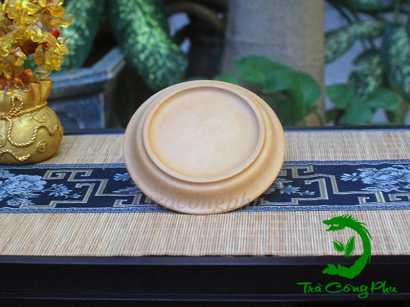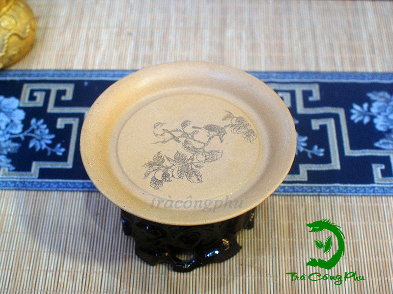 Với kích thước nhỏ gọn đường kính 8 cm và chiều cao 2 cm, chiếc đế ấm này không chỉ giúp nâng niu ấm trà mà còn mang yếu tố phong thủy đặc biệt. Trên mặt đế tròn là hình ảnh hai con chim sẻ cùng với cành lựu. Hình ảnh hai chú chim sẻ mang ý nghĩa vui tươi, tự do và báo tin lành, còn cành lựu với nhiều hạt biểu trưng cho gia đình đông con nhiều cháu, cuộc sống đủ đầy. Vì thế, “chim đậu trên cành lựu” gửi gắm thông điệp về gia đình êm ấm, phúc khí dồi dào, đồng thời thể hiện ước vọng dòng tộc hưng thịnh và hạnh phúc bền lâu.